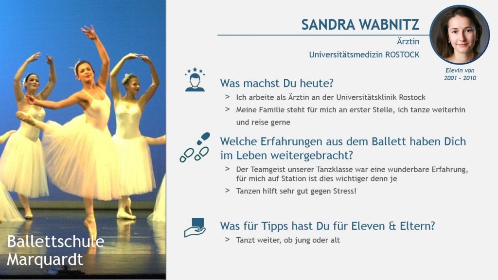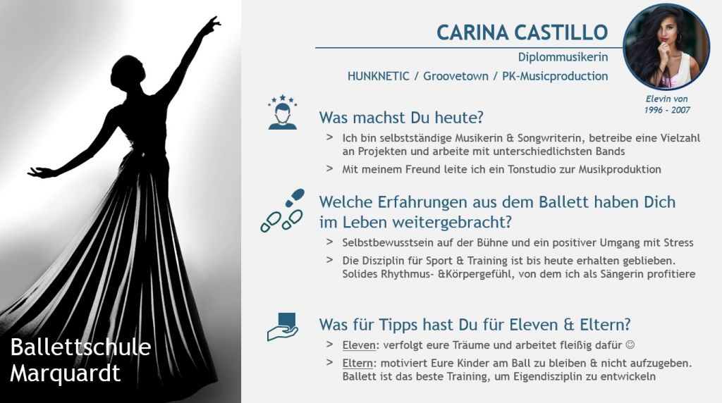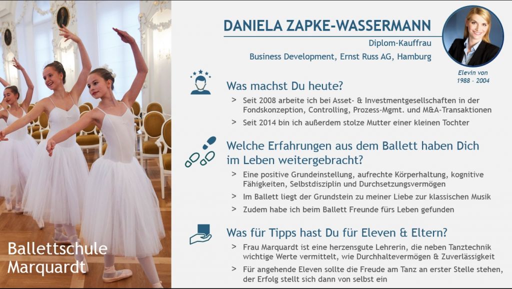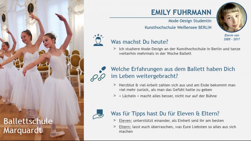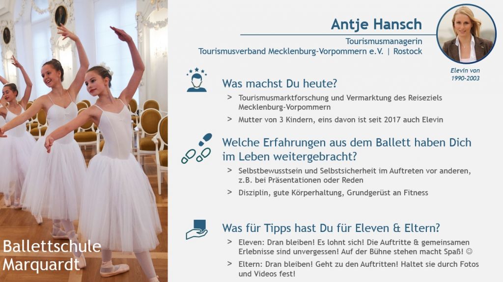 Ehemalige Schüler berichten von ihren jetzigen Tätigkeiten und wie sie durch Ballett posititv geprägt wurden. Außerdem gibt es kleine Tipps für Eleven & Eltern.