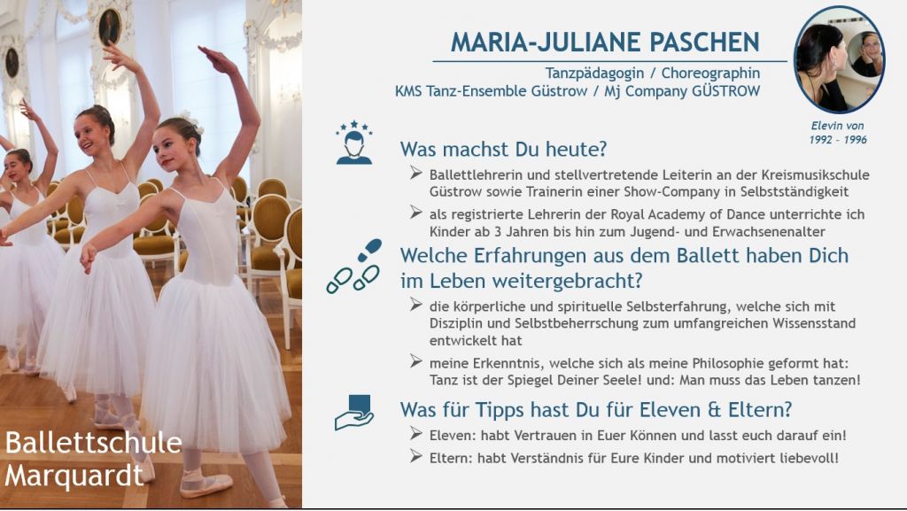 Musikschule in Güstrow Musikschule in Bad Doberan Leitung Ballettschule Zimmermann in Hamburg Tanzwerkstatt in Weimar |